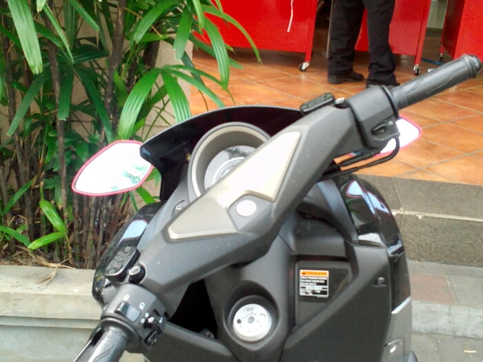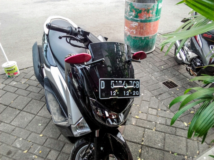 Hai, hello…. Apa kabarnya hari ini? semoga sehat selalu. Masih ngomongin spion. Jika kemaren spion yg beda merk dan ukuran nempel di vario 125, sekarang spion unik nempel di N-Max. Alih-alih di stang, sang pemilik pasang spionnya di windshield.