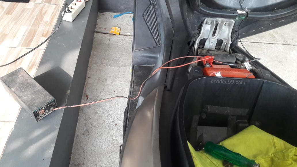 Karena dulu pernah ngalamin aki tekor, dan solusinya di jumper, saya ke rumah orang tua untuk minjem Vega R buat jumper aki. Setelah menceritakan kasus yang terjadi, Bapak saya nyaranin pake charger/power supply. Saya langsung menolak karna dayanya kecil, hanya 3 Ah, lebih cepet dari aki ke aki aja pake kabel, kata saya.