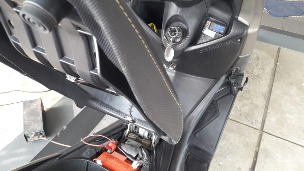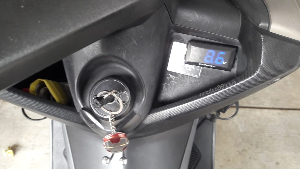 Keluarin motor dan putar kunci ke on, zziinngg, terdengar suara fuel pump bekerja. M.I.D menyala normal, volt meter juga loading. Tapi pas udah statis, volt meter menunjukkan angka 8.6 Volt. Dan pas starter dipencet, tidak ada reaksi apapun, pencet klakson pun seperti sedang dibungkam dengan sapu tangan yang sudah direndam kloroform (eh kok kayak psikopat mau nyulik orang jadinya…?? 😅).