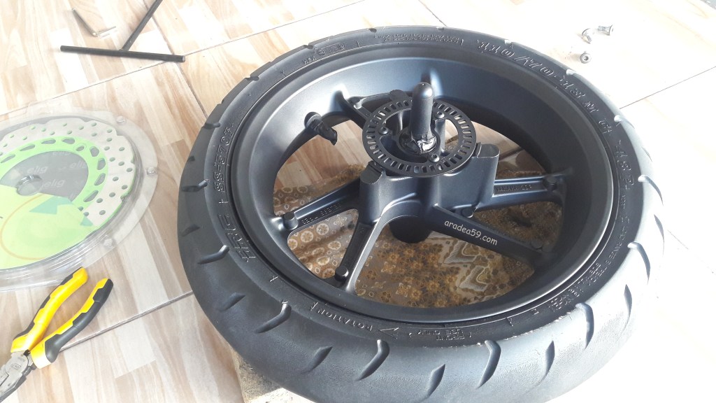 Sebelum pengerjaan, ban baru nya sudah saya beli terlebih dahulu, dan cat semprotnya. Baik. Pertama-tama buka baut ban dengan kunci 14 di kiri, dan kunci 17 di kanan. Kunci 14 nya hanya untuk megangin aja biar gak ikut muter as roda nya. Setelah itu, copot juga piringan cakram, karena saya sudah menyiapkan cakram baru dari elig.