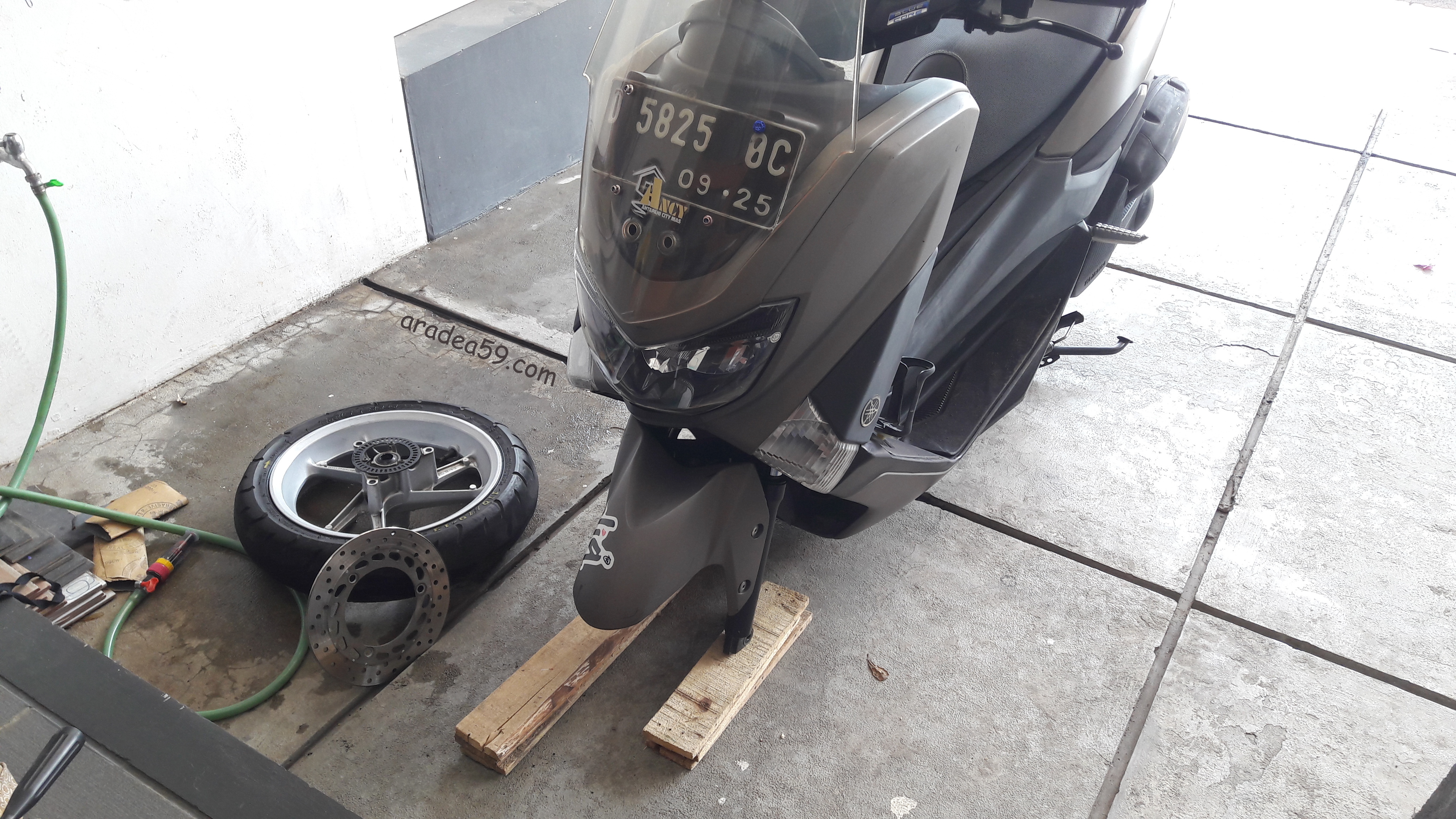 Sebelum pengerjaan, ban baru nya sudah saya beli terlebih dahulu, dan cat semprotnya. Baik. Pertama-tama buka baut ban dengan kunci 14 di kiri, dan kunci 17 di kanan. Kunci 14 nya hanya untuk megangin aja biar gak ikut muter as roda nya. Setelah itu, copot juga piringan cakram, karena saya sudah menyiapkan cakram baru dari elig.