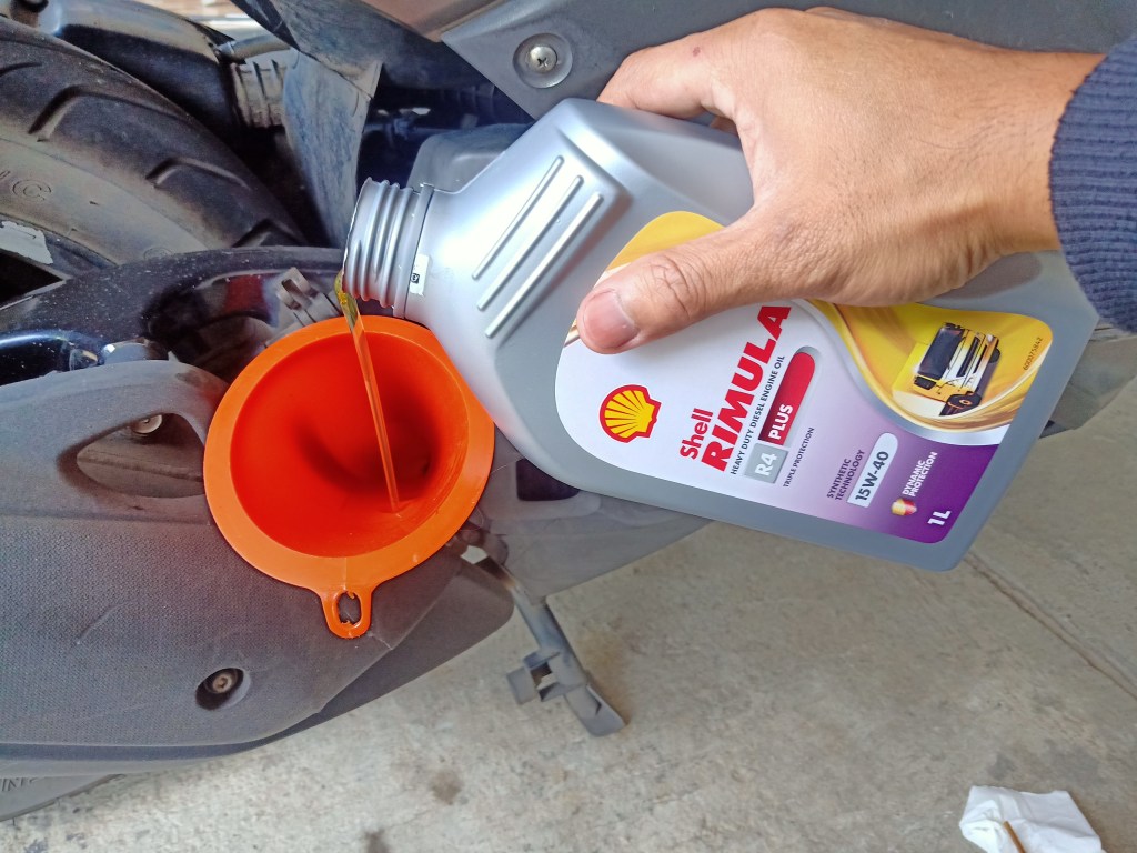 Seperti biasa, sebelumnya harus melakukan ritual mengurangi 100 ml dulu, kalau tidak mesin akan kepenuhan dan tarikan akan menjadi berat. Setelah itu baru tuang oli seperti biasa.